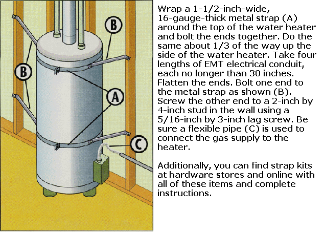 Also, strap in your hot water heater; if it remains upright following an earthquake you can use it as an emergency source of water if water lines are broken or contaminated. See how to secure a water heater (JPG).